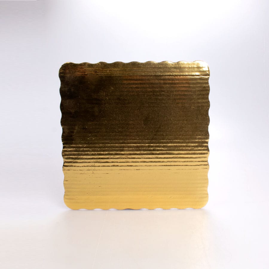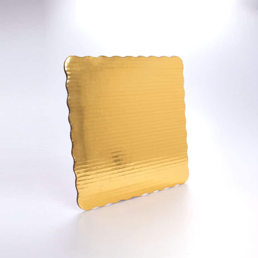 Base de 26×26 cm con acabado dorado, ideal para pastelería de gran tamaño. Firme y decorativa.