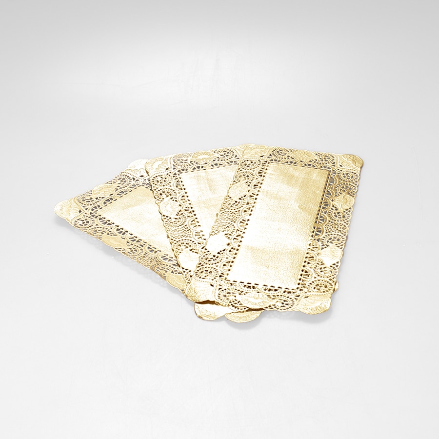 Paquete de 100 blondas rectangulares doradas de 15×30 cm, ideales para charolas de repostería fina. Perfectas para mayoreo y eventos que requieren distinción.