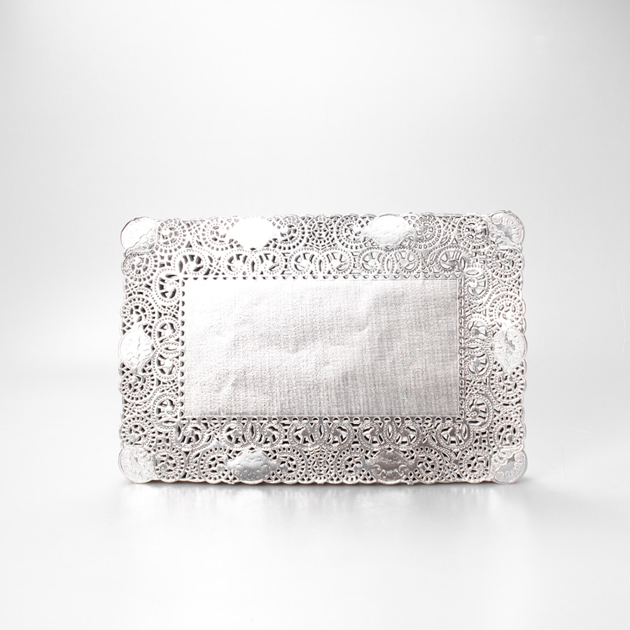 Blonda rectangular plateada de 20×30 cm, paquete de 100 piezas, ideal para charolas de catering, pastelerías y mesas de dulces.