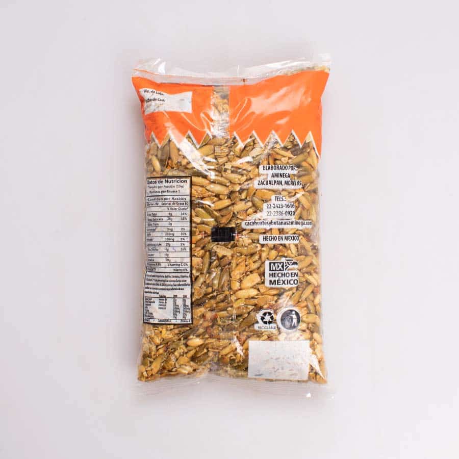 500 gramos de semilla frita Aminega. Crocante, con sabor fuerte, ideal para los amantes de lo salado. Muy vendida en puestos de botanas, mercados o tienditas tradicionales. Se puede mezclar con cacahuates o nueces.