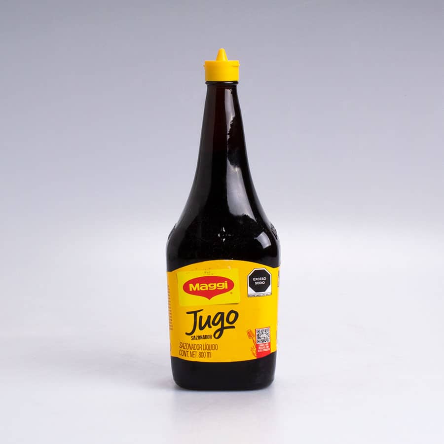 Botella de 800 ml de Jugo Maggi, excelente para negocios medianos, fondas, comedores o uso doméstico avanzado. Aporta sabor profundo, salado y característico a carnes, guisos, caldos y más.
