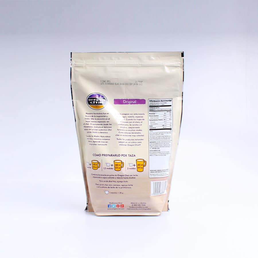 Polvo sabor chai latte de Oregon, ideal para preparar bebidas calientes estilo café de especialidad o frappés especiados. Ideal para cafeterías, panaderías y reposterías que deseen ofrecer algo diferente y aromático en su menú.