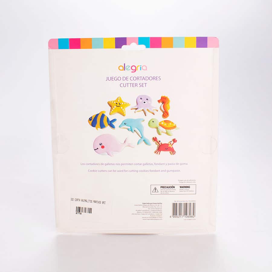 El Set Cortadores Animalitos Marinos 8 Pz Alegria es un accesorio que se emplea para poder realizar cortes divertidos sobre masa de galletas, además se puede emplear en masas de decoración como el fondant y así crear las decoraciones más divertidas para decoración.